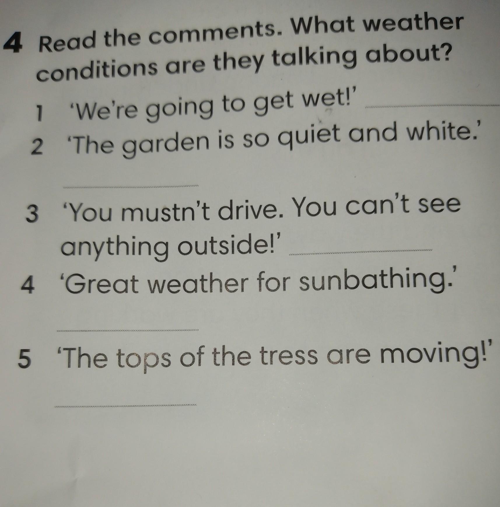 "Ми промокнемо!" 2 Сад такий тихий і білий. ' Ви не повинні їздити за кермом. Зовні нічого не видно! 4 Чудова погода для прийняття сонячних ванн. ' 5 Вершини тресу рухаються! "