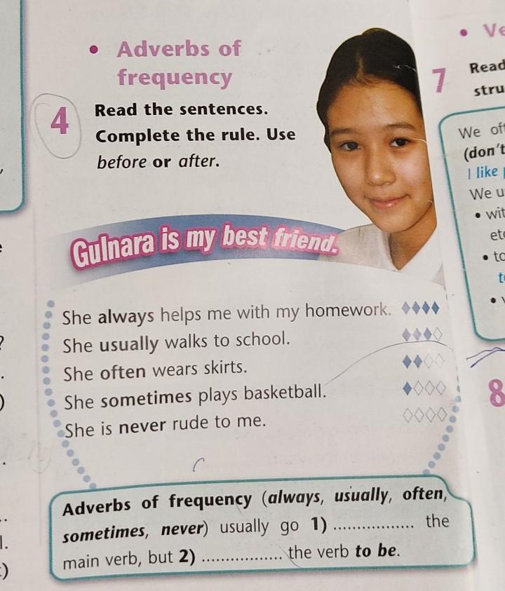 • Adverbs of frequency Read the sentences. Complete the rule. Use before or after. 17 4 We (d 1 Gulnara is my best friend. She always helps me with my homework. **** She usually walks to school. She often wears skirts. She sometimes plays basketball. She is never rude to me. C Adverbs of frequency (always, usually, often, sometimes, never) usually go 1) ........... the main verb, but 2) .... ....... the verb to be.