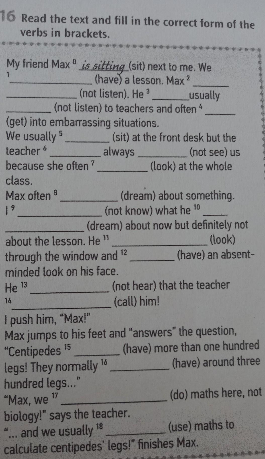 Ответ: We are having; Max doesn't listen; He is usually doesn't listen; often gets; sitting; is always doesn't see; she often looks; Max dreaming; i don't know what he dreaming; He is looking; and having; He is not hearing; teacher calling him; Haves; Having; we are doing; using.