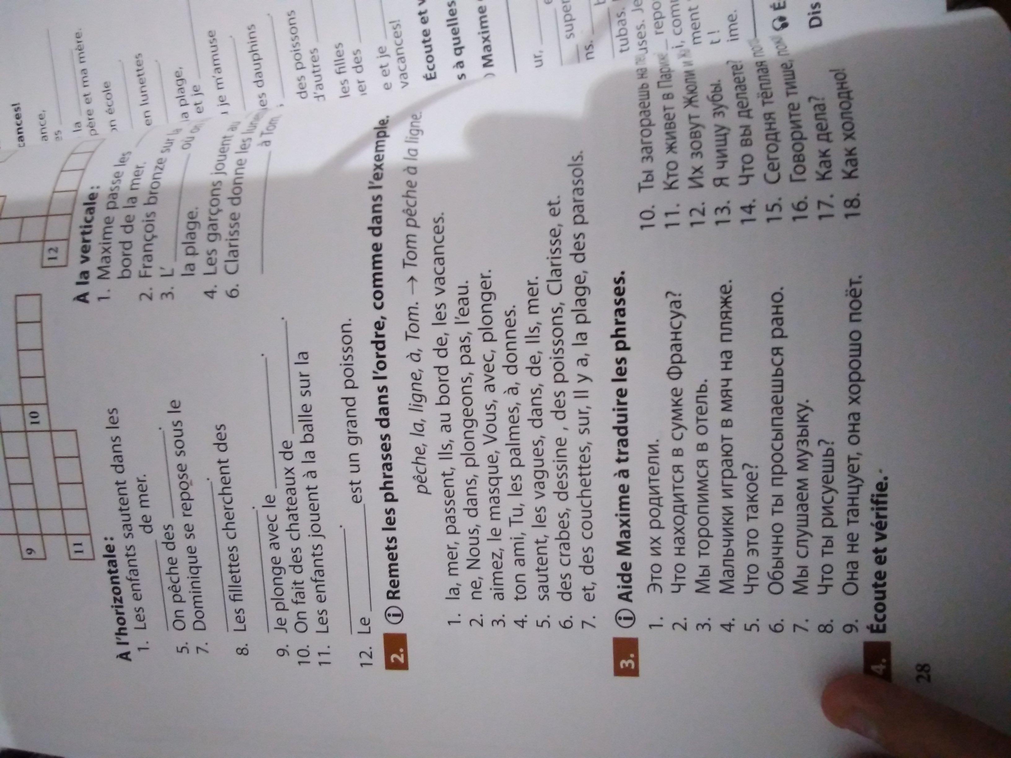 2.1. Ils passe les vacanses au bord de la mer. 2.Nous ne plongeons pas dans l'eau. 3.Vous aimez plonger avec le masque. 4.Tu donnes les palmes à ton ami. 5.Ils sautent dans les vageus de mer. 6.Clarisse dessine des poissons et des crabes. 7.Il y a es couchettes et des parasols sur la plage.