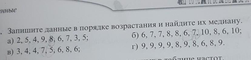 а) 2,3,4,5,5,6,7,8,9 медиана 5