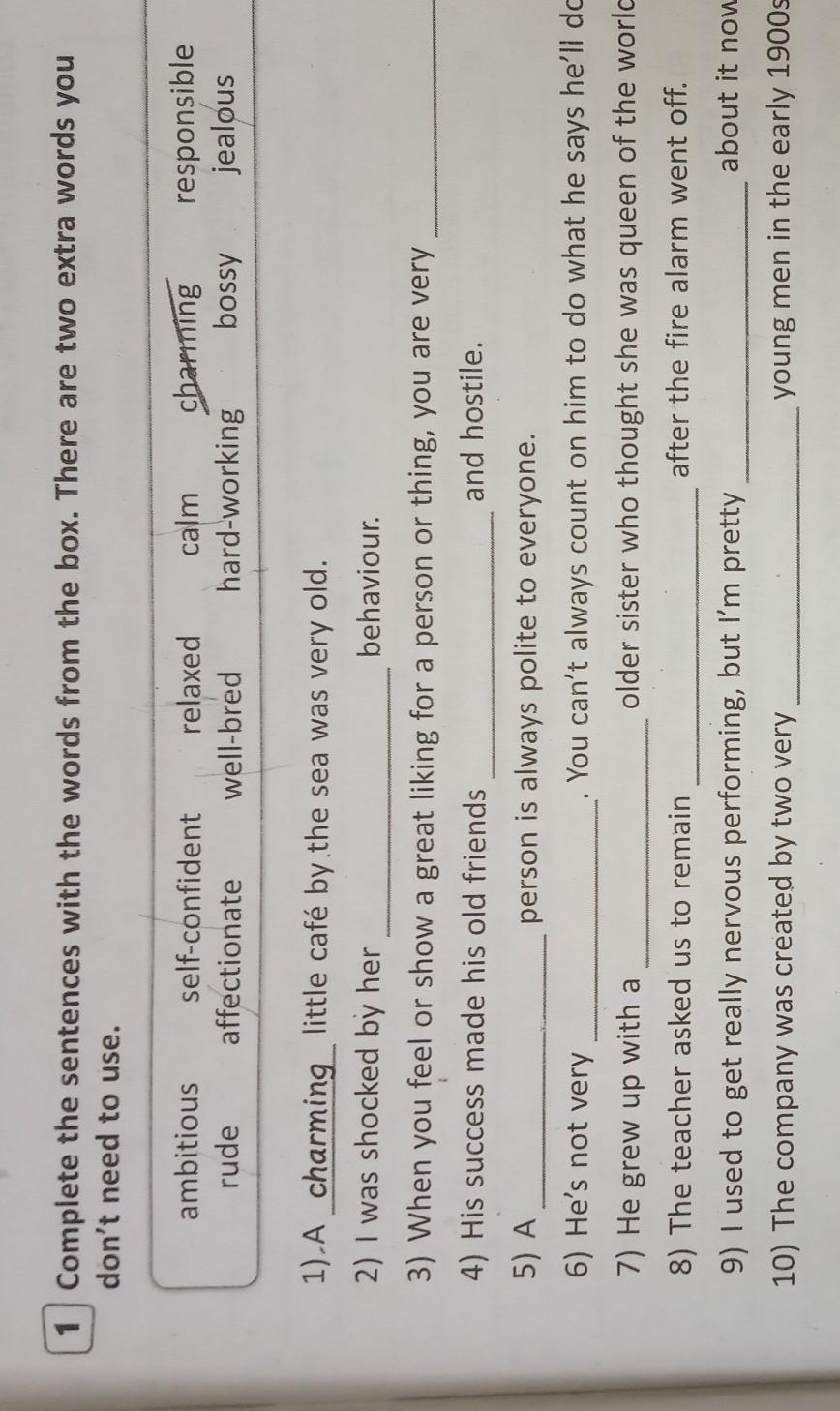 1 Complete the sentences with the words from the box. There are two extra words you don't need to use. ambitious self-confident relaxed responsible calm hard-working Bues bossy rude affectionate well-bred snojeaf 1).A charming little café by the sea was very old. 2) I was shocked by her behaviour. 3) When you feel or show a great liking for a person or thing, you are very 4) His success made his old friends and hostile. 5) A person is always polite to everyone. You can't always count on him to do what he says he'll do. older sister who thought she was queen of the world. 6) He's not very 7) He grew up with a 8) The teacher asked us to remain after the fire alarm went off. 9) I used to get really nervous performing, but I'm pretty about it now.- 10) The company was created by two very young men in the early 1900s.