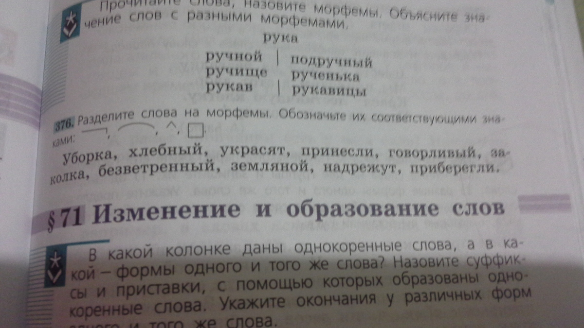 у-бор-к-а, хлеб-н-ый, у-крас-ят, при-нес-л-и, говор-лив-ый, за-кол-к-а, без-ветр-енн-ый, земл-ян-ой, над-реж-ут, при- берег- л-и.