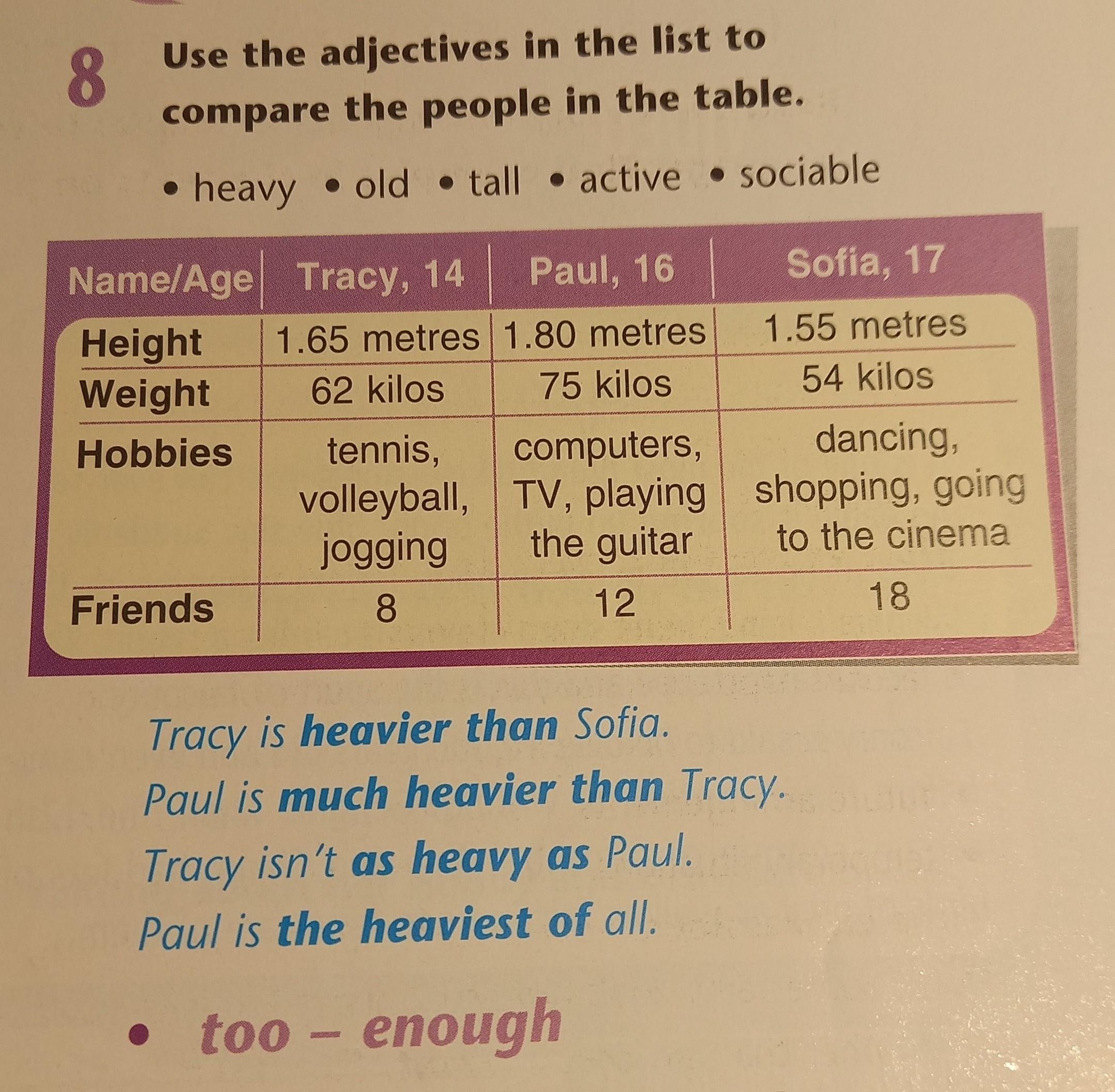 8 Use the adjectives in the list to compare the people in the table. • heavy • old tall • active • sociable Name/Age Tracy, 14 Paul, 16 Sofia, 17 Height 1.65 metres 1.80 metres 1.55 metres Weight 62 kilos 75 kilos 54 kilos Hobbies tennis, computers, dancing, volleyball, TV, playing shopping, going jogging the guitar to the cinema Friends 8 12 18 Tracy is heavier than Sofia. Paul is much heavier than Tracy. Tracy isn't as heavy as Paul. Paul is the heaviest of all. • too - enough