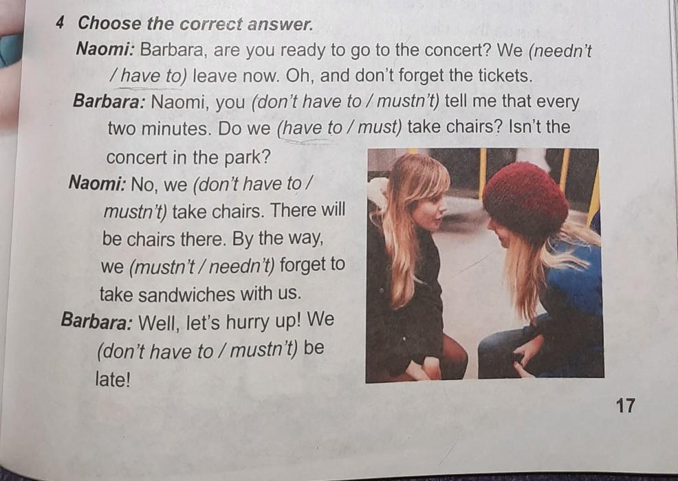B: N. you mustn't tell me that every...(Не надо говорить мне об этом каждую минуту)/ ... Do we must take chairs?(Нам следует взять с собой стулья? - Концерт будет на воздухе