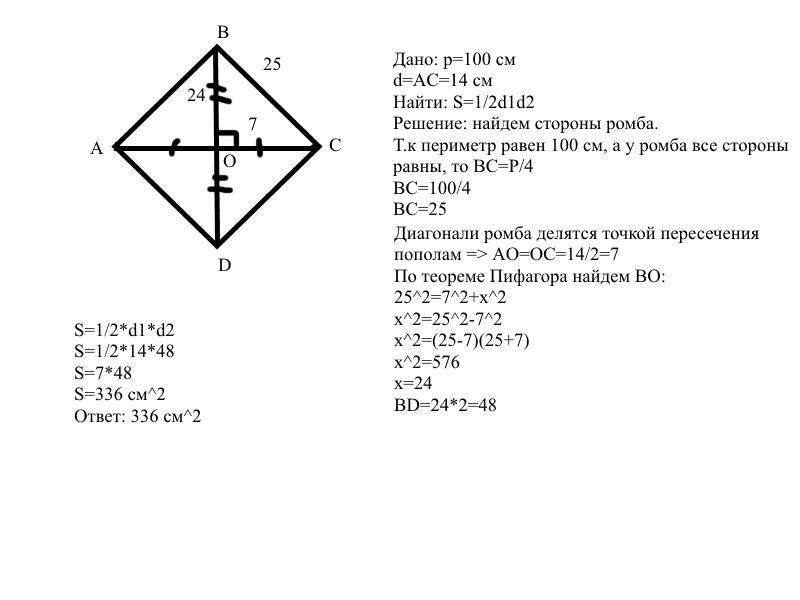 третий раз вопрос задаю, ну реально помогите пожалуйста, дан ромб, p=100см., d=14 см.-диагональ. найти: s=1/2d, d2. (рисунок, дано, подробный ответ, пж)