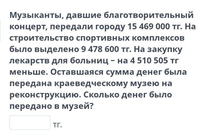 15 469 000 - 9 478 600 - 4 510 505 = 1 479 895 (тг) - дали музею