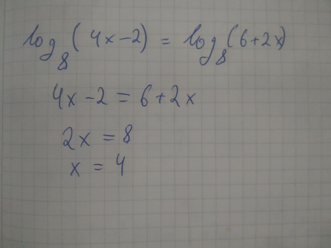 Если логарифмы с одинаковым основанием,то начинаем решать степень => 4x-2=6+2x => 2x =8 , x = 4