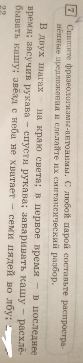 17 Спишите фразеологизмы-антонимы. С любой парой составьте распростра- нённые предложения и сделайте их синтаксический разбор. В двух шагах - на краю света; в первое время - в последнее время; засучив рукава спустя рукава; заваривать кашу - расхле. бывать кашу; звёзд с неба не хватает семи пядей во лбу; не по- 22