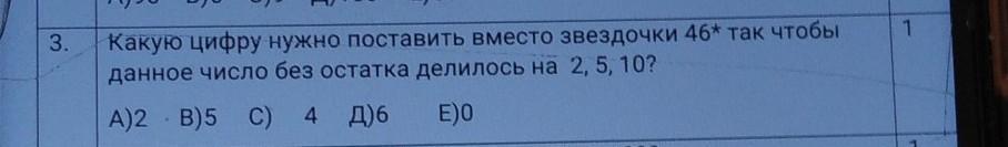 Какую цифру нужно поставить вместо звёздочки 46* так чтобы данное число без остатка делилось на 2, 5, 10? помогите пж оч нужно контроха по матеше