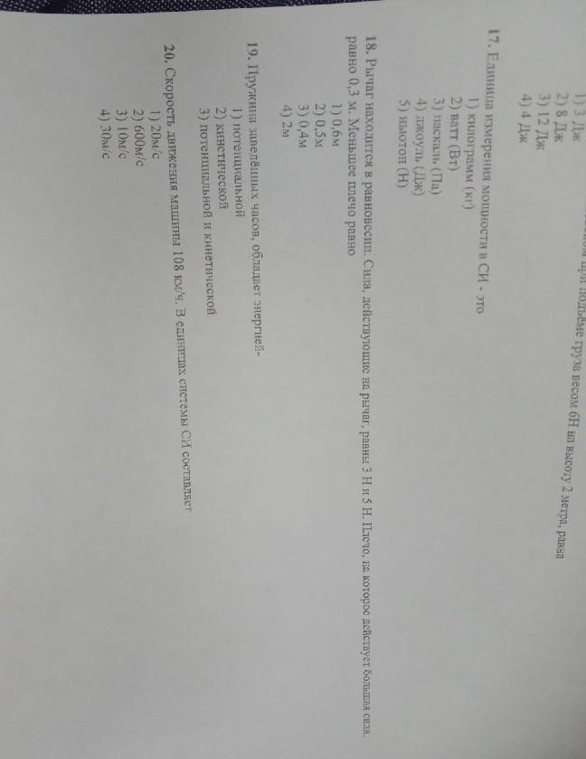 Диагностическое тестирование по физике за курс 7 класса 2 вариант 1. Укажите, что относится к понятию «вещество»: 1) вода 2) автобус 3) метр 4) свет 2. К звуковым явлениям относится 1) таяние снега 2) раскаты грома 3) рассвет 4) полёт птицы 3. Какой из перечисленных приборов вы бы взяли для измерения длины парты? 1) рулетка 2) мензурка 3) термометр 4) спидометр 4. Засолка овощей происходит 1) быстрее в холодном рассоле 2) быстрее в горячем рассоле 3) одновременно и в горячем и в холодном рассоле 5. Путь, пройденный телом при равномерном прямолинейном движении, определяется по формуле S 1) 2) 3) St 4) o't 6. Для измерения массы тела используют 1) термометр 2) весы 3) секундомер 4) рулетку равна 7. Масса тела объёмом 5 м и плотностью 100 кг/м 1) 20 кг 2) 105 кг 3) 500 кг 4) 95 кг 8. Всс тела - это сила, 1) с которой тело притягивается к Земле 2) с которой телю вследствие притяжения к Земле действует на опору или подвес 3) с которой тело действует на другое тело, вызывающее деформацию 4) возникающая при соприкосновении поверхностей двух тел и препятствующая перем