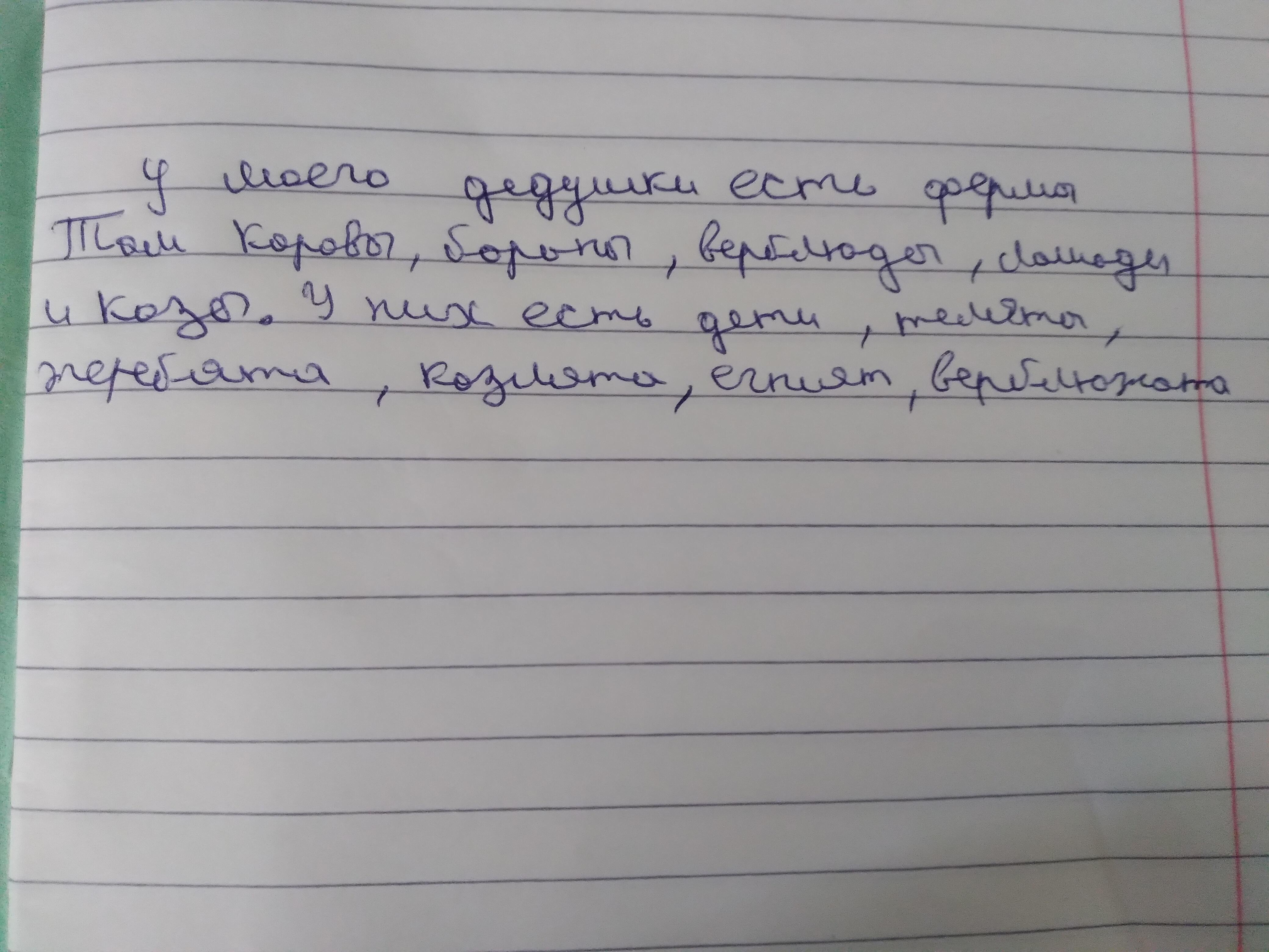Менің атамның фермасы бар. Сиыр,қамқыр, жылқы,түйе мен бар. Бізде бұзау, лақ, бота, қозы,құлын бар.