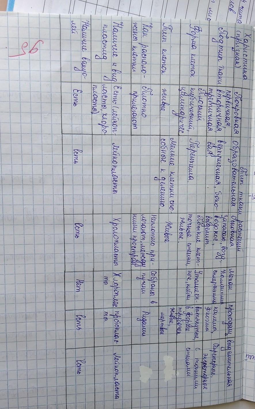 Характеристика (признак) Покров- Тип ткани растений образова- основ- Механи- Прово- тельная ная ческая дящая Вылеу НАЯ тельная Подтип ткани форма клеток Тип клеток Как расположены ке Наличие и тип TIJIACH Наличие вакуолей