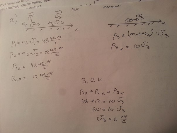 Два шарика массами 6 кг и 4 кг движутся по горизонтальной поверхности со скоростями 8 м/с и 3 м/с. С какой скоростью они будут двигаться после неупругого удара (как одно целое), если: а) первый шар догонит второй; б) шары движутся навстречу друг другу?