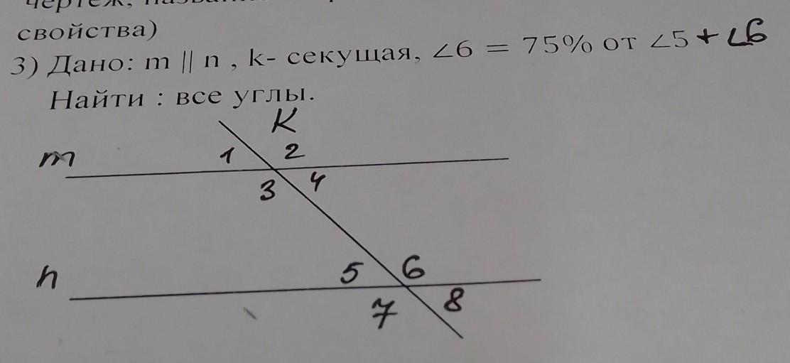 угол 5+6=180 градусов (из условия 6=75 процентам) следовательно угол 6 равен 135 градусов