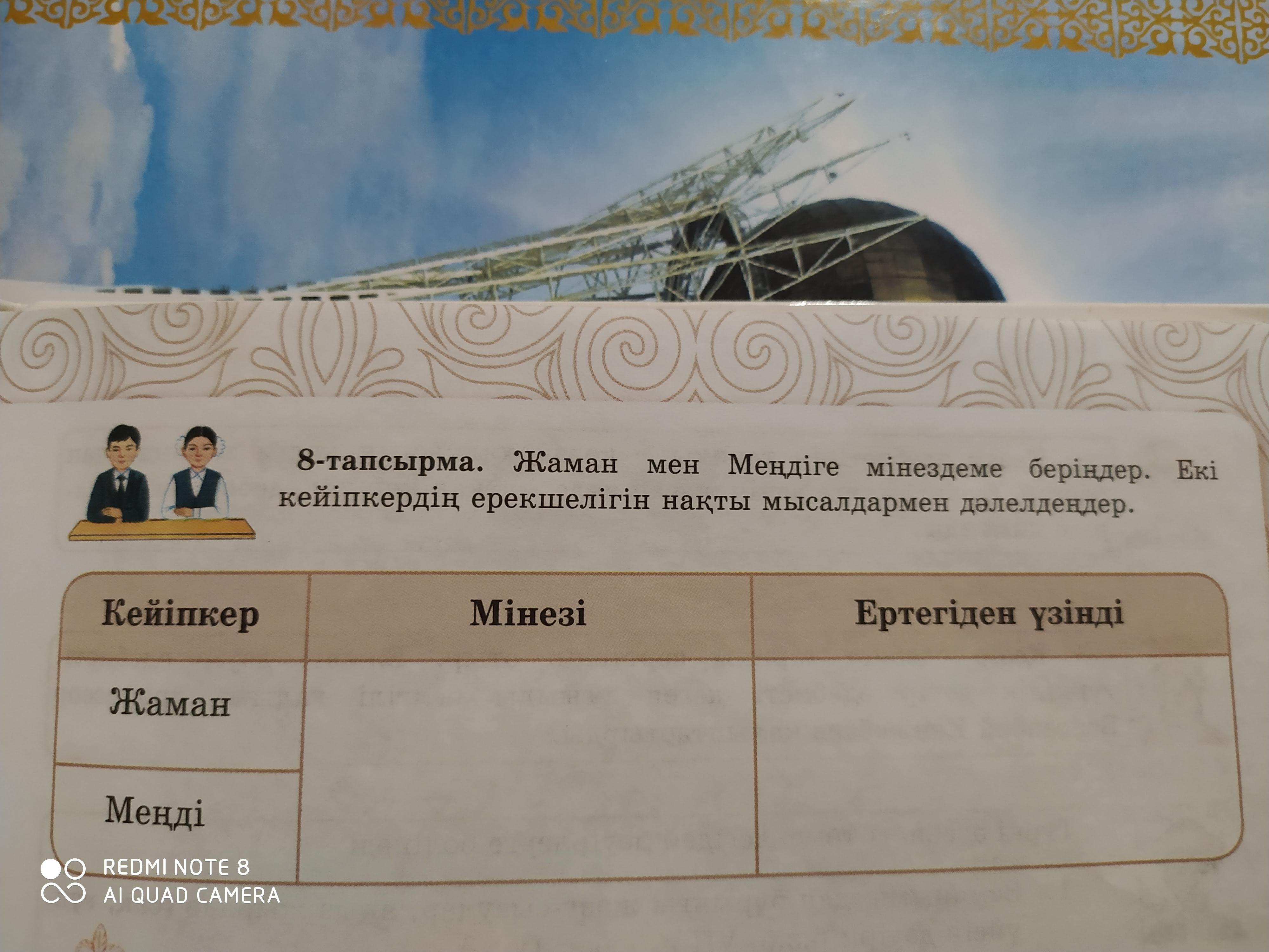 8-тапсырма.Жаман мен Меңдіге мінездеме беріңдер.Екі кейіпкердің ерекшелігі нақты мысалдармен дәлелдендер.6 сынып помогите плиз все полностью помогите