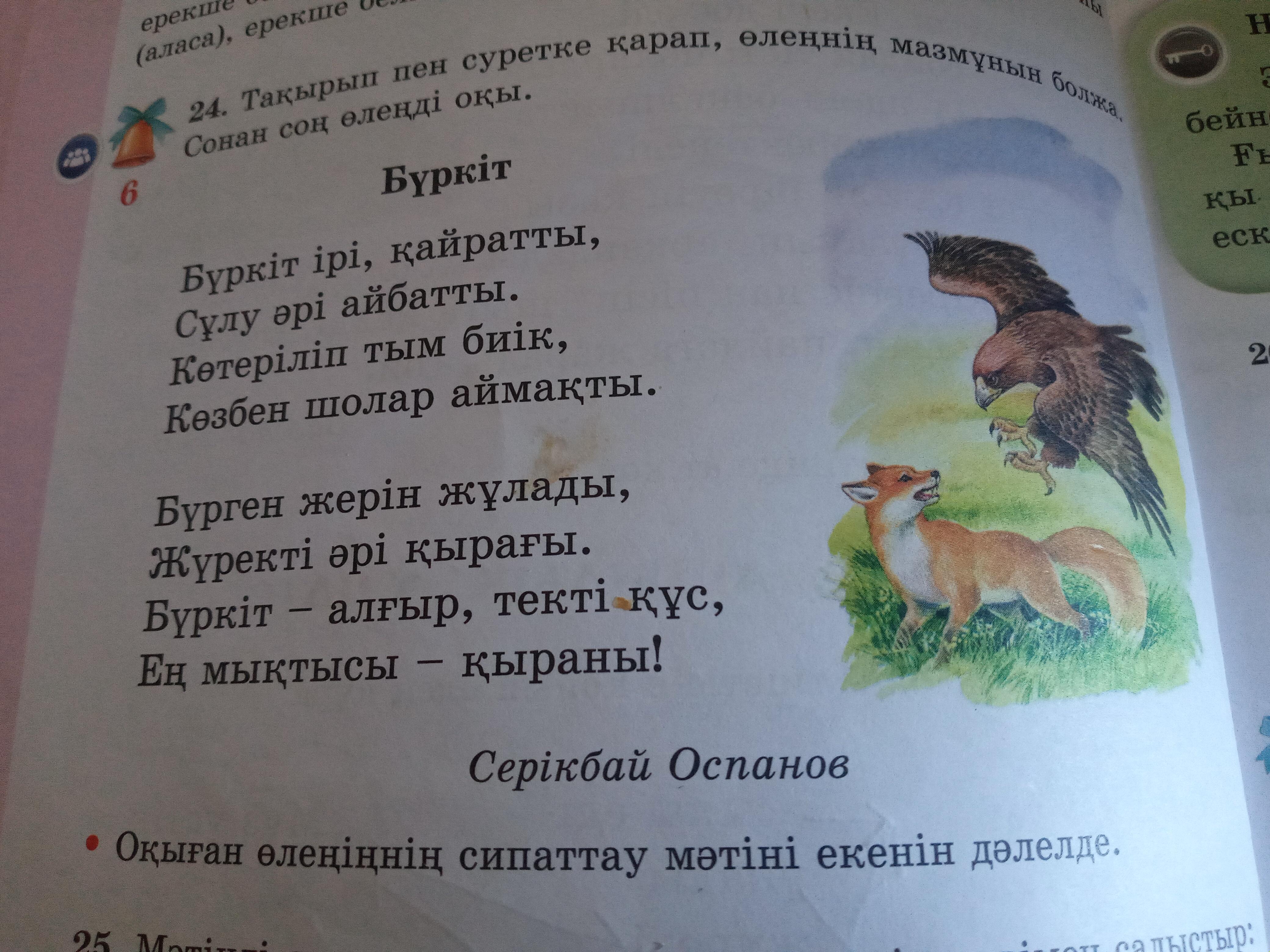Өлең сипаттау мәтініне жатады. Өйткені бұл өлеңде бүркіттің қандай екені жазылған, мысалы: "Бүркіт ірі, қайратты, сұлу әрі айбатты" "Жүректі әрі қырағы, бүркіт - алғыр, текті құс, ең мықтысы - қыраны!" деген өлең жолдарынан байқауға болады.