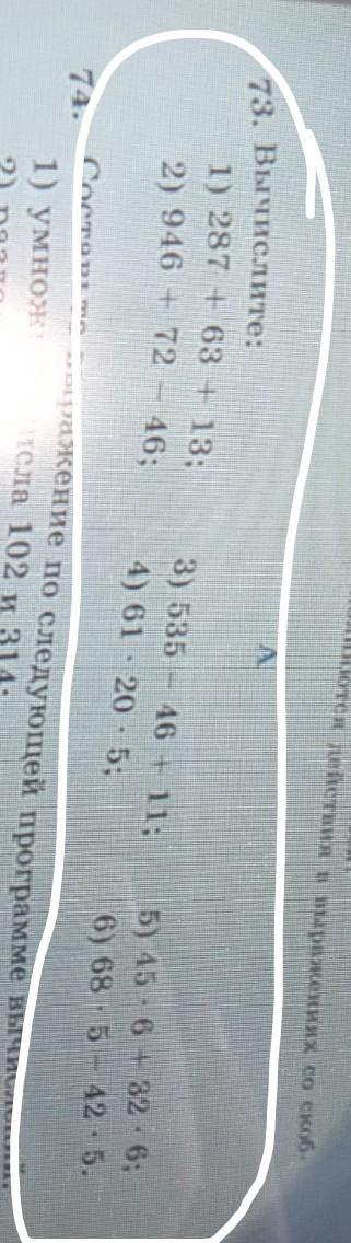 А 73. Вычислите: 1) 287 +63 + 13; 2) 946 + 72 - 46: 3) 535 - 46 + 11: 4) 61 20.5 5) 456- 32.6: 6) 68 - 5- 425 помогите пожалуйста