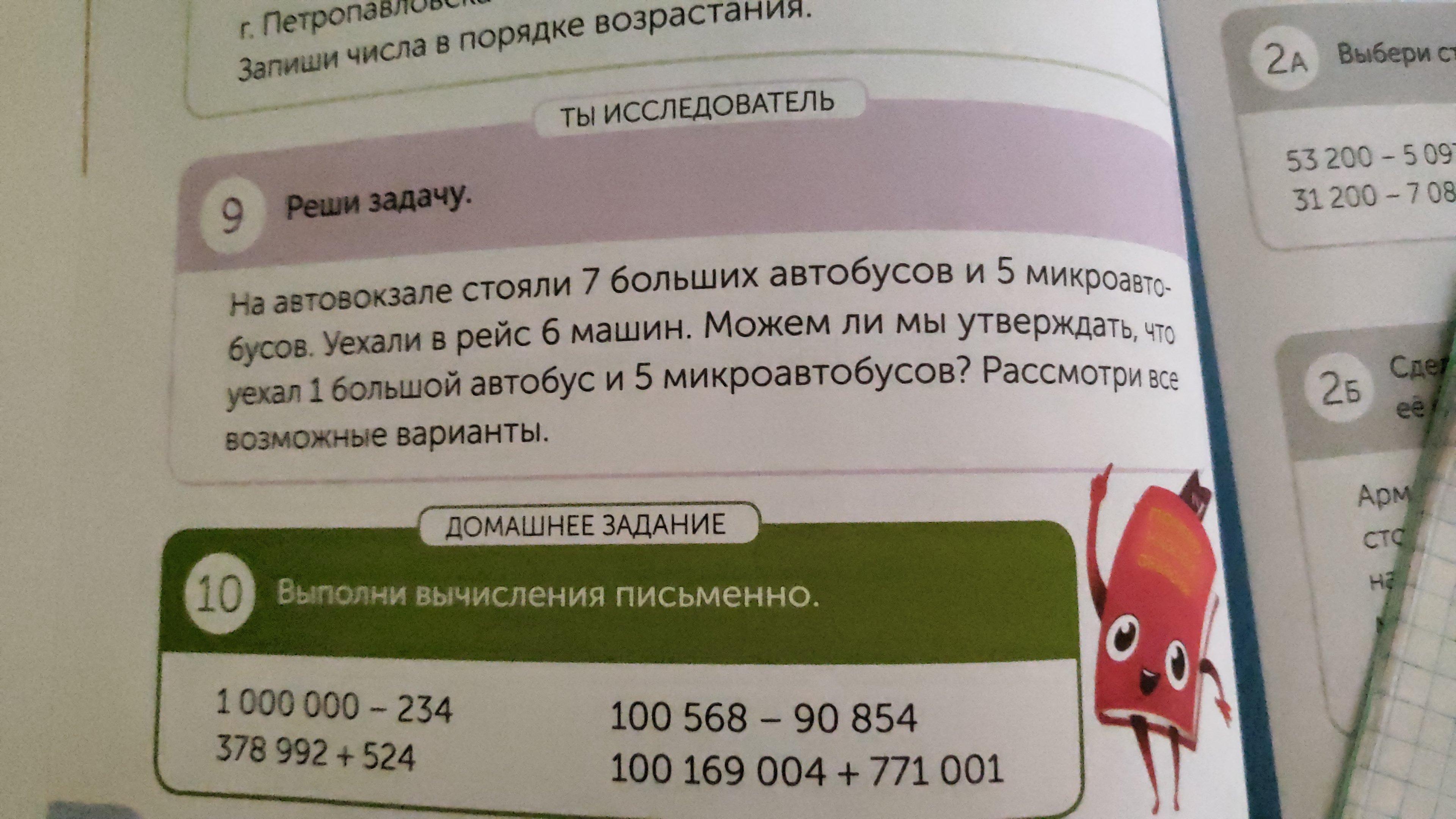 На автовокзале стояли 7 больших автобусов и 5 микроавтобусов. Уехали в рейс 6 машин. Можем ли мы утверждать, что уехал 1 большой автобус и 5 микроавтобусов? Рассмотри все возможные варианты.