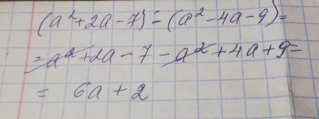 (a² + 2а - 7) - (а² - 4а - 9) = a² + 2а - 7 - а² + 4а + 9 = 6a + 2 = 2(3a + 1)