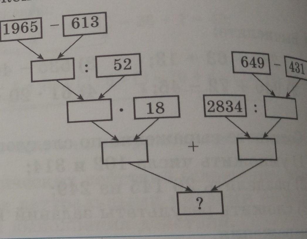 79. Составьте по схеме выражение и найдите его значение: - 613 2) 1965 1) 649 52 431 228 :|19 4 1 18 21 1 2834: 135 + 203 + ? ? 74. 3) 32 133. 75. 1) 730; 2) 6076; 3) 430; 4) 171. 77. 23. 78. 1) 20; 2) 5; 3) 4. 79. 1) 86; 2) 481.