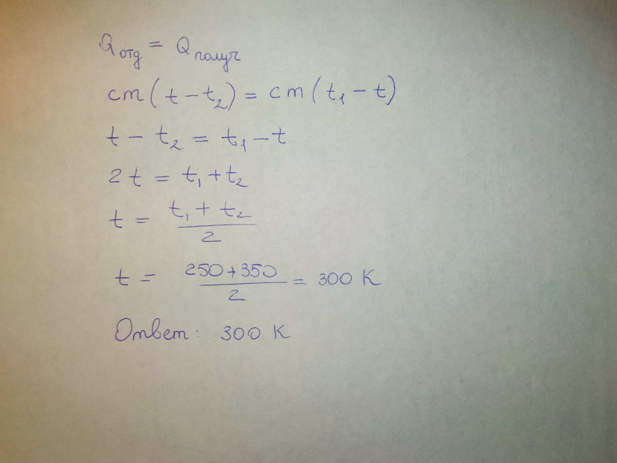 при смешивании двух жидкостей одинаковой массы с одинаковыми удельными теплоемкости,но разной температуры-температура первой жидкости 250 К,температура второй 350 К-температура образовавшейся смеси будет равна:
