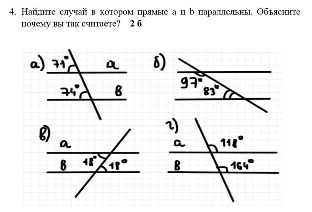 Найдите случай, в котором прямые a и b параллельны. Объясните, почему вы так считаете?