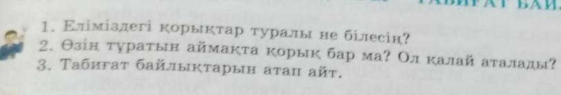 1. Еліміздегі қорықтар туралы не білесің? 2. Өзің тұратын аймақта қорық бар ма? Ол қалай аталады? 3. Табиғат байлықтарын атап айт.