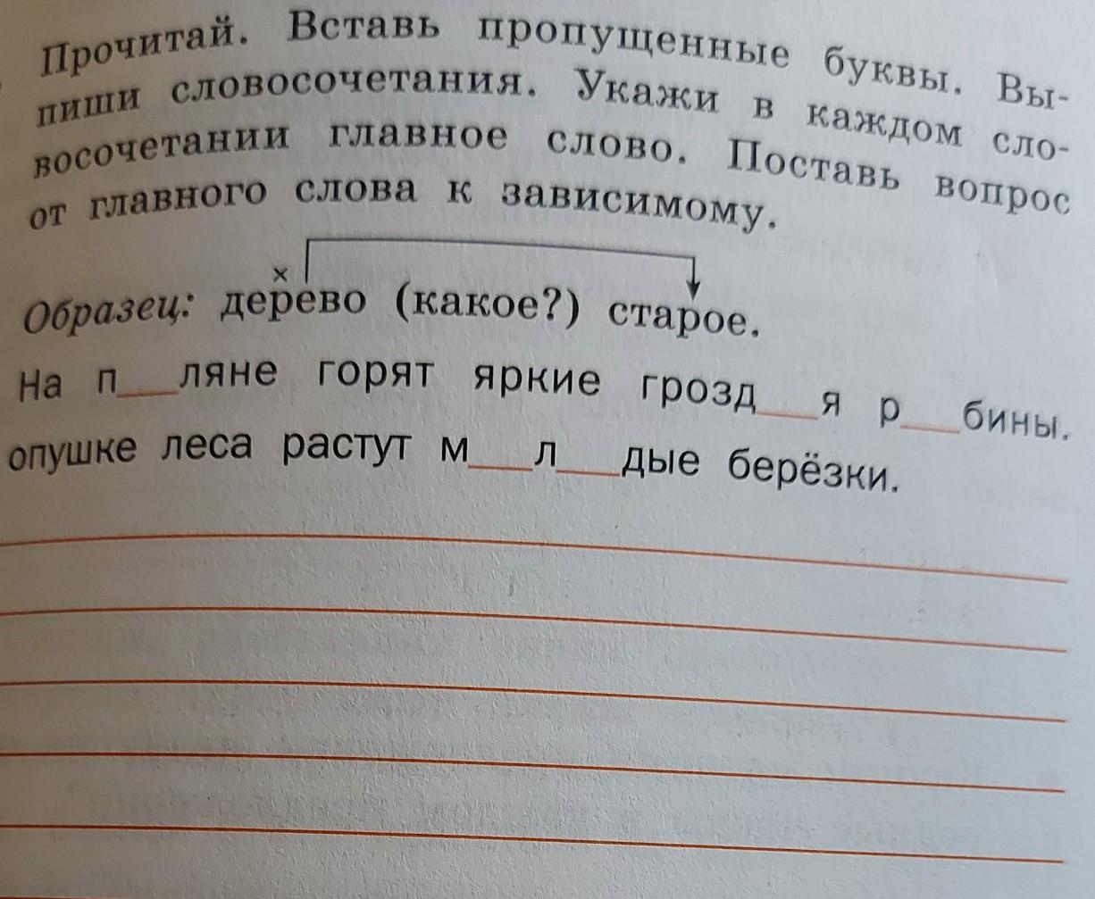 На поляне горят яркие гроздья рябины. ( гроздья (какие?) яркие))