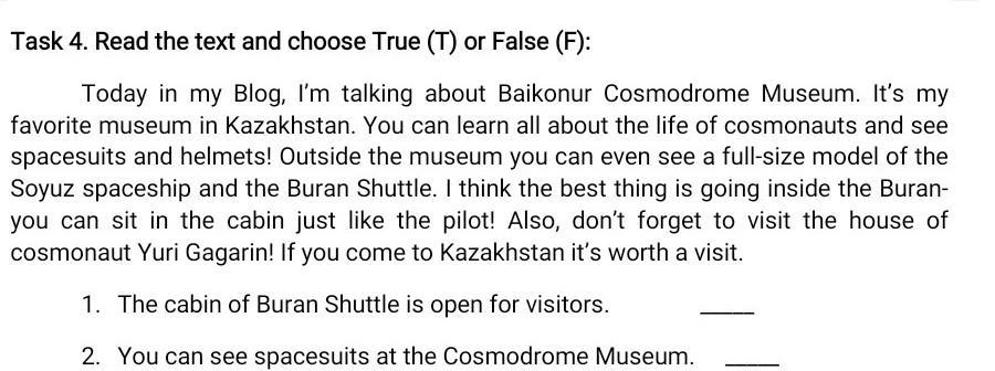 2. You can see spacesuits at the Cosmodrome Museum. (T-true) если внимательно прочитать текст, можно увидеть в нём эти строчки.