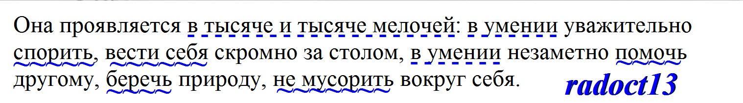 Она проявляется в тысяче и тысяче мелочей: в умении уважительно спорить, вести себя скромно за столом, в умении незаметно помочь другому, беречь природу, не мусорить вокруг себя.