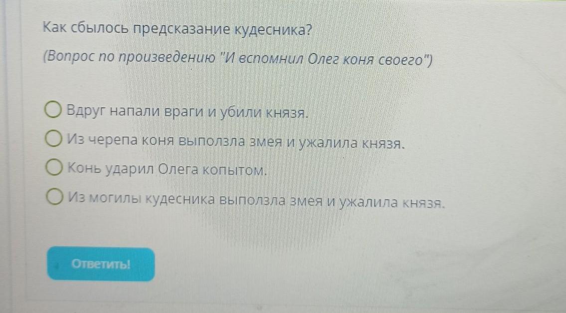 Как сбылось предсказание кудесника? (Вопрос по произведению "И вспомнил Олег коня своего") ОВдруг напали враги и убили князя. ОИз черепа коня выползла змея и ужалила князя. Конь ударил Олега копытом. ОИз могилы кудесника выползла змея и ужалила князя. ОГНИТИ