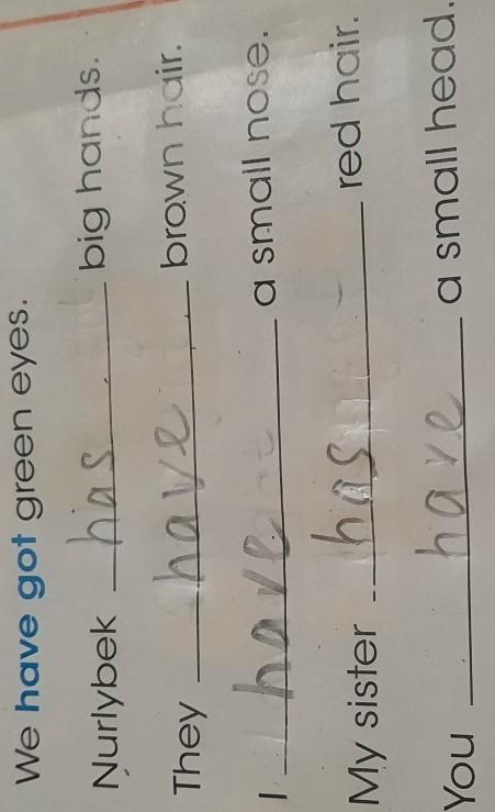 7 Complete. Use have got or has got. 1 We have got green eyes. 2 Nurlybek has big hands. 3 They brown hair. 4 I have a small nose. 5 My sister has red hair. 6 You have a small head.