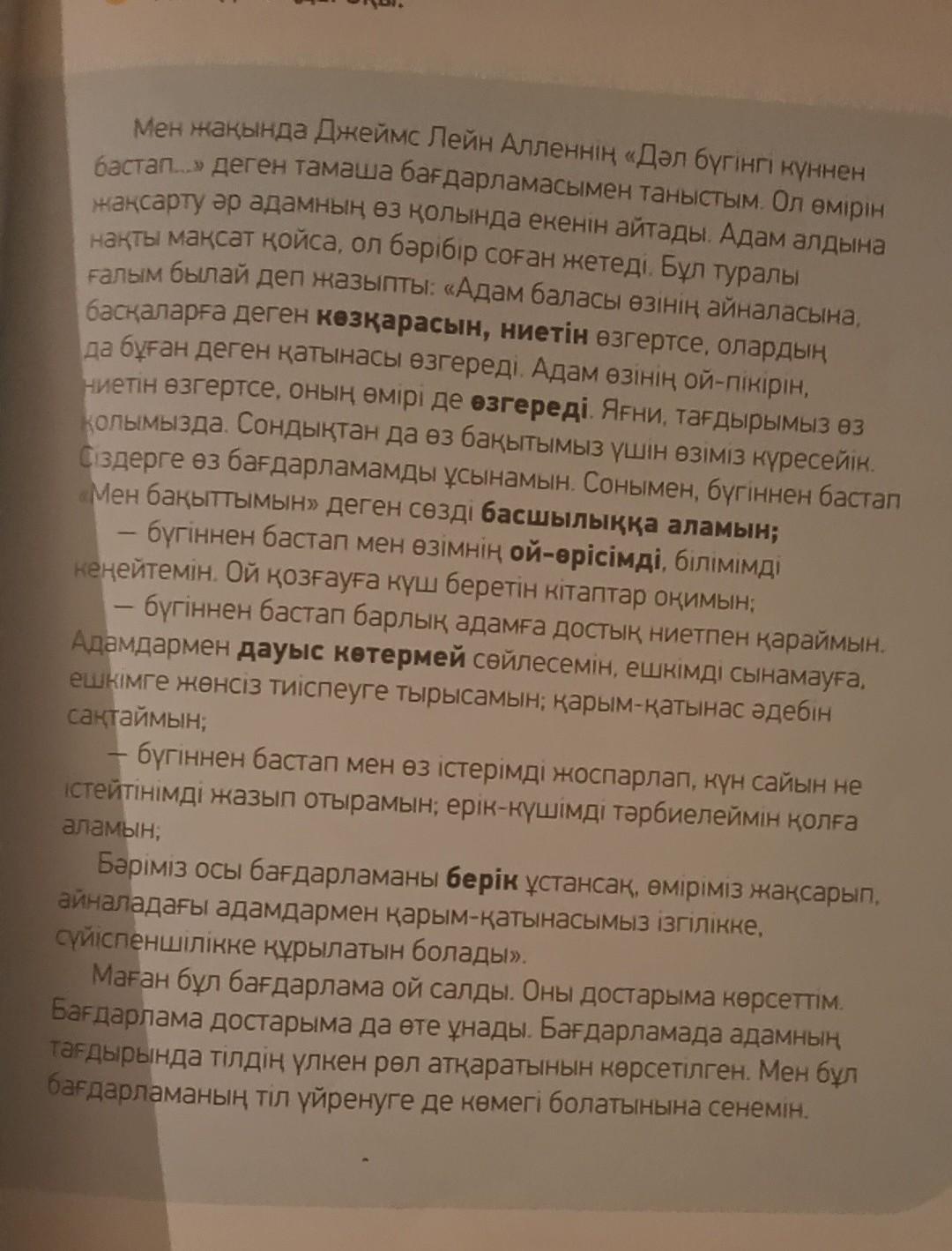 Ответ: Біздің болашағымыз өзіміздің қолымызда. Адам өз өмірін жақсарту үшін нақты мақсат қою ккрек, ой-пікірі,ниеті жақсы болу керек.Адам мәдениетті бола бiлу керек, сыпайы, кiшiпейiл болуы керек
