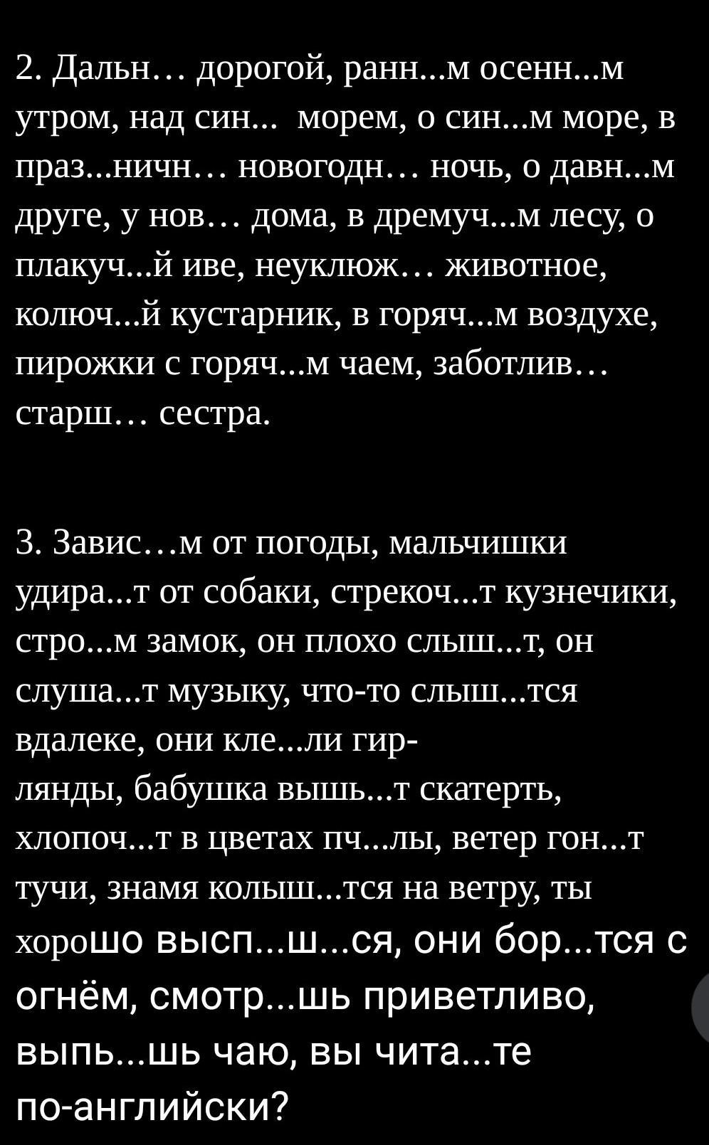 3. ЗависИм от погоды, мальчишки удираЮт от собаки, стрекочУт кузнечики, строИм замок, он плохо слышИт, он слушаЕт музыку, что-то слышИтся вдалеке, они клеИли гирлянды, бабушка вышьЕт скатерть, хлопочУт в цветах пчЁлы, ветер гонИт тучи, знамя колышЕтся на ветру, ты хорошо выспИшЬся, они борЮтся с огнём, смотрИшь приветливо, выпьЕшь чаю, вы читаЕте по-английски?