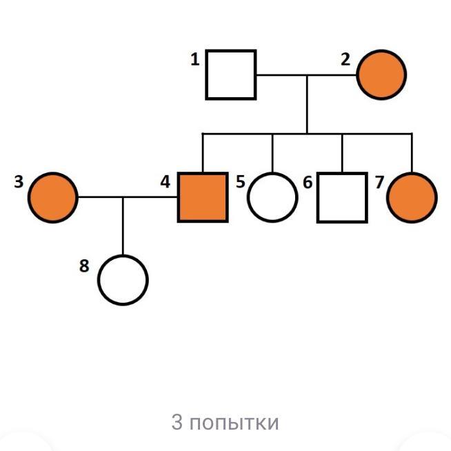 На схеме изображена родословная определённой семьи. Символы, заполненные оранжевые цветом, означают членов семьи, у которых проявляется некое заболевание.
