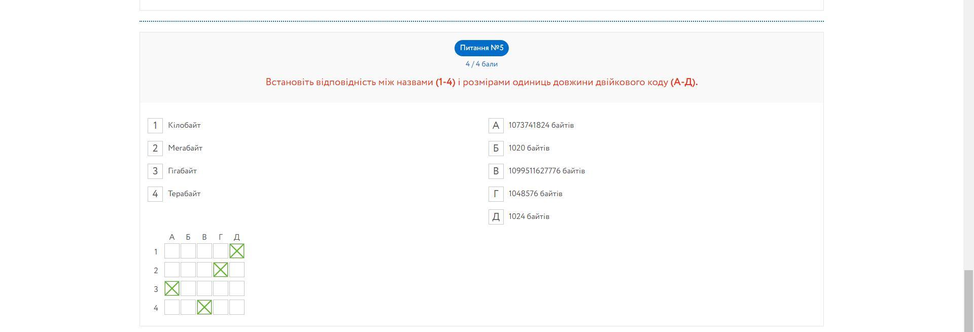 Питання №1 ? 2 бали У якому вигляді зберігаються літери тексту в комп’ютері? У вигляді 8-бітового двійкового коду У вигляді 1 біту У вигляді файлів У вигляді малюнків Питання №2 ? 2 бали Скільки біт в одному байті? 32 16 8 1 Питання №3 ? 2 бали Визначте довжину двійкового коду повідомлення за умови, що повідомлення закодовано з використанням таблиці кодів символів Windows-1251: Учітеся, брати мої, думайте, читайте. 32 37 54 20 Питання №4 ? 2 бали Довжина двійкового коду повідомлення складає 2 байти. Виразити це значення в бітах. 32 24 16 8 Питання №5 ? 1 бал Встановіть відповідність між назвами (1-4) і розмірами одиниць довжини двійкового коду (А-Д). Кілобайт Мегабайт Гігабайт Терабайт 1073741824 байтів 1099511627776 байтів 1020 байтів 1024 байтів 1048576 байтів А Б В Г Д 1 2 3 4