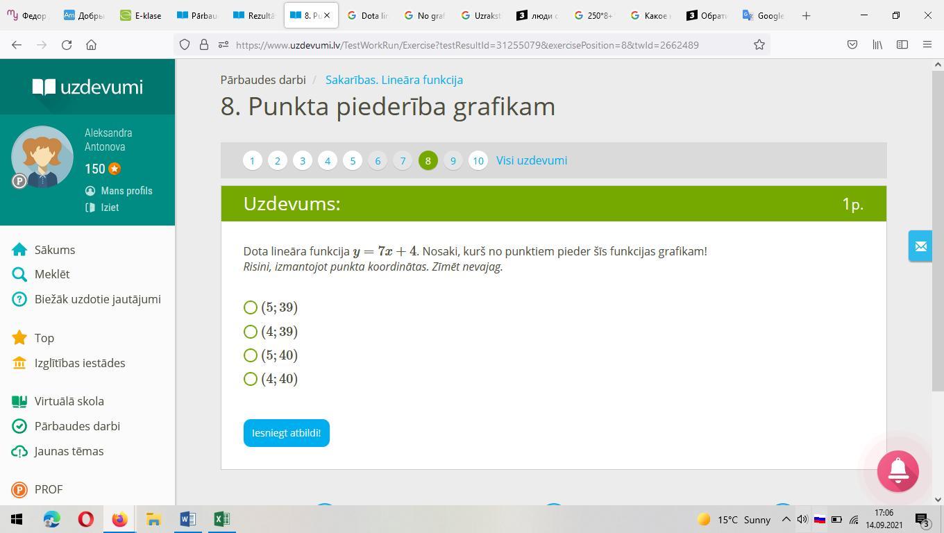 Дана линейная функция y = 7x + 4. Определите, какая из точек принадлежит расписанию этой функции!