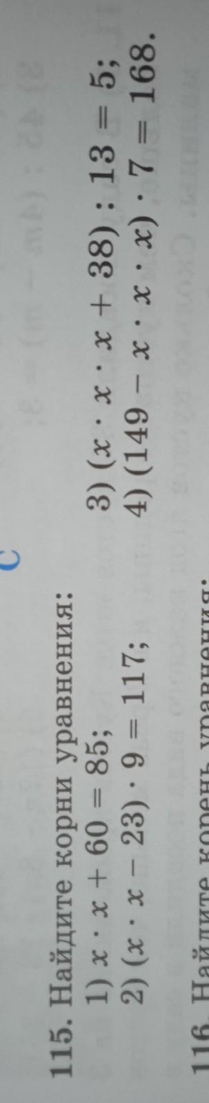 115. Найдите корни уравнения: 1) х х + 60 = 85; 2) (x - x - 23). 9 = 117; 3) (x x x + 38): 13 = 5; 4) (149 - x x - x) 7 = 168.