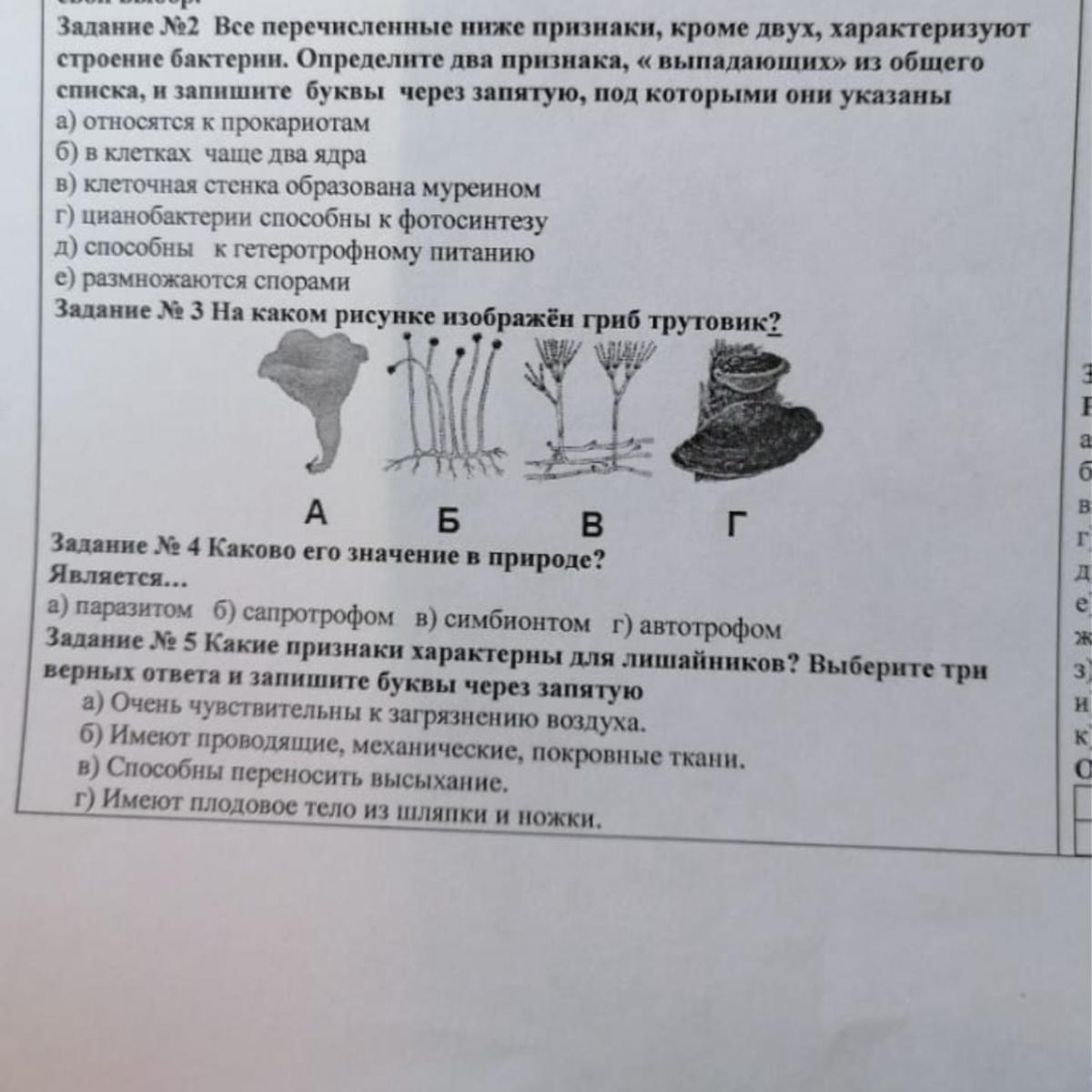 5.ав третьего верного ответа нет,потому что лишайники относятся к низшим растениям,поэтому они не дифференцированы на ткани и органы.Плодовое тело из шляпки и ножки имеют грибы,но не лишайники,хоть они и являются симбиозом гриба и водоросли.