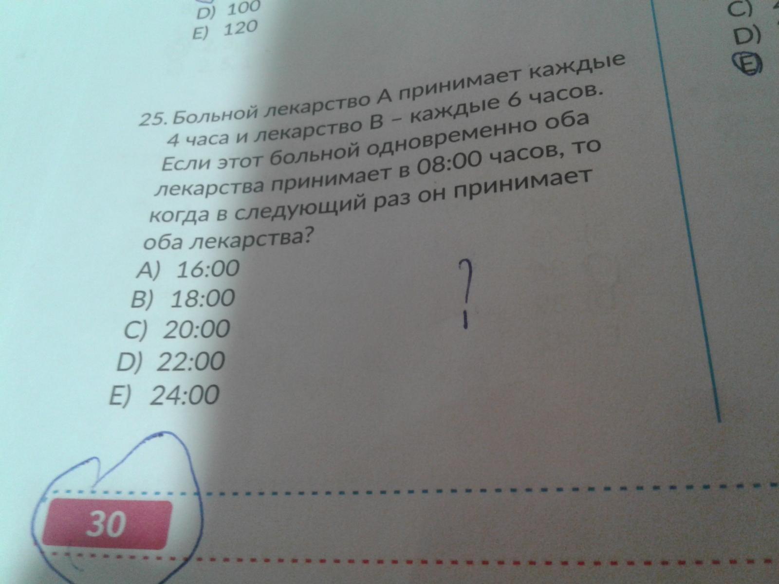 сначала находим наименьшее общее кратное между 6 и 4 так мы узнаем через сколько часов больной примет лекарство одновременно потом прибавляем к 8:00 12 так как это наименьшее общее кратное и получаем 20:00