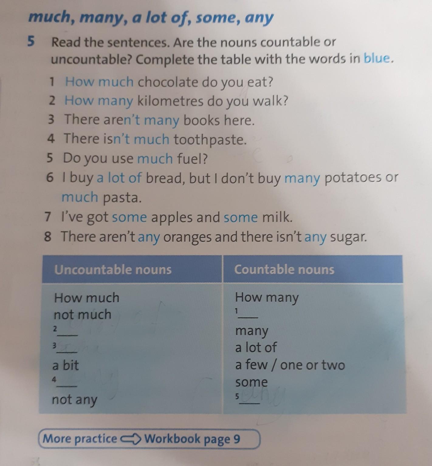 Read the sentences. Are the nouns countable or uncountable?Complete the table with the words in blue.