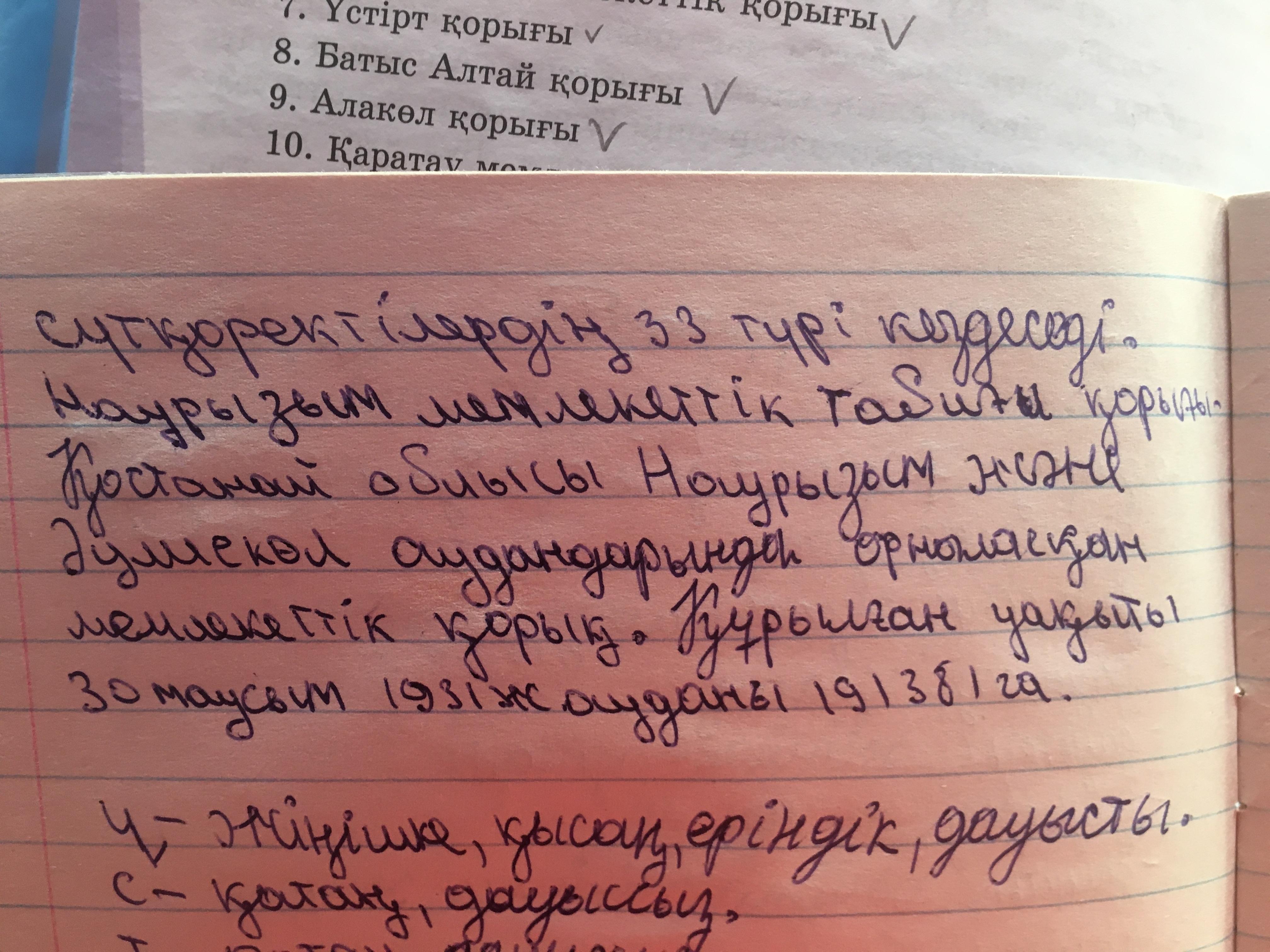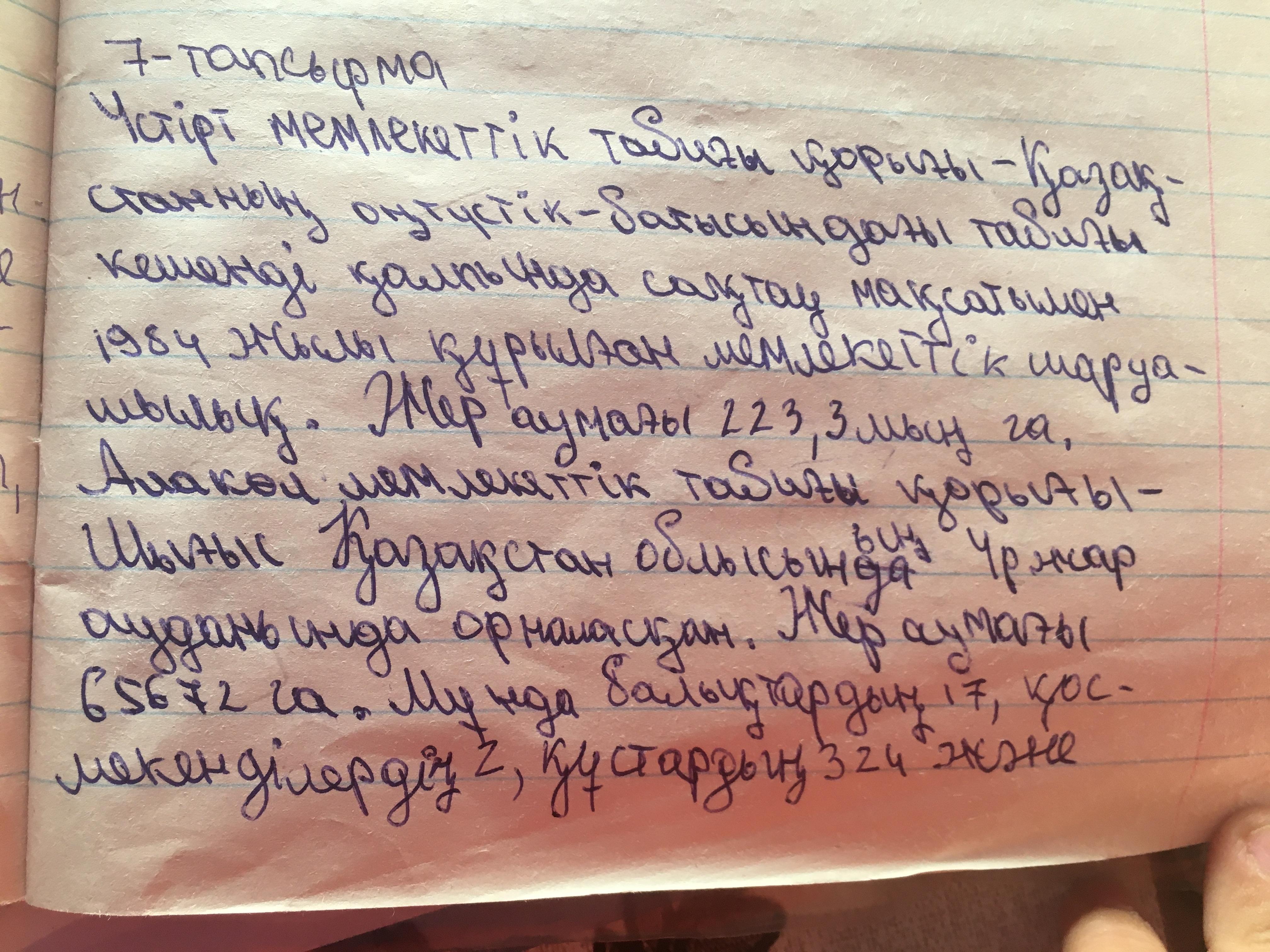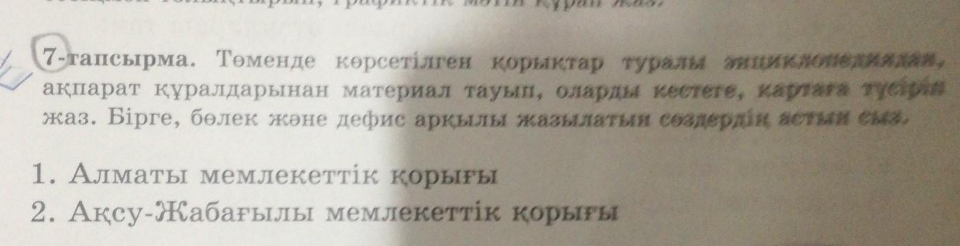 7-тапсырма. Төменде көрсетілген қорықтар туралы энциклопедиядан, ақпарат құралдарынан материал тауып, оларды кестеге, картаға түсіріп жаз. Бірге, бөлек және дефис арқылы жазылатын сөздердің астын сыз.