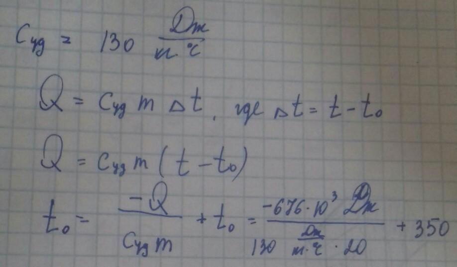Какой была первоначальная температура золотого слитка массой 20кг, если при его нагревании до 350ºС было затрачено количество теплоты 676кДж?