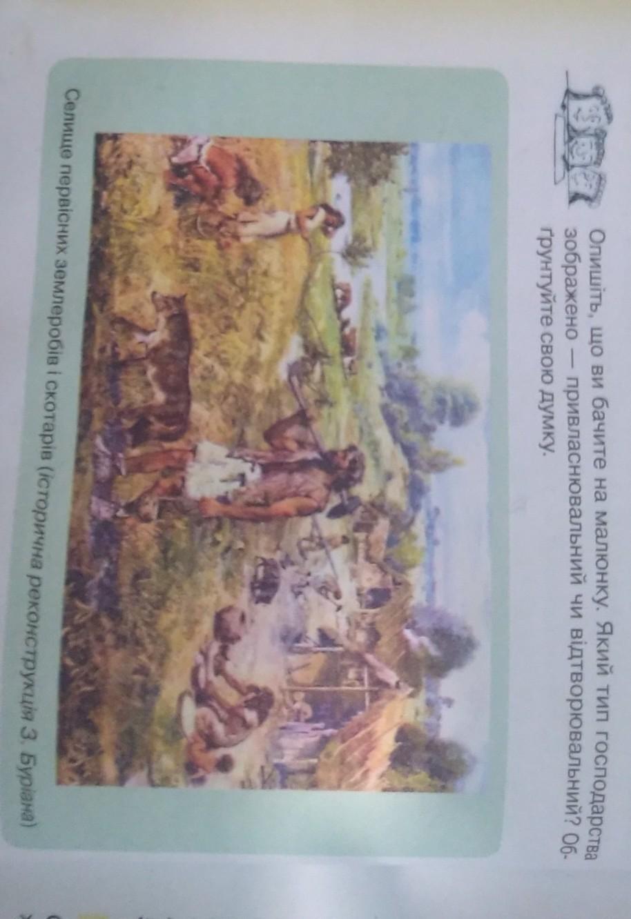 Это видстворювальний. Потому что здесь мы можем видеть как строятся первобытные дома,высыхают глиняные глечики,видимскот