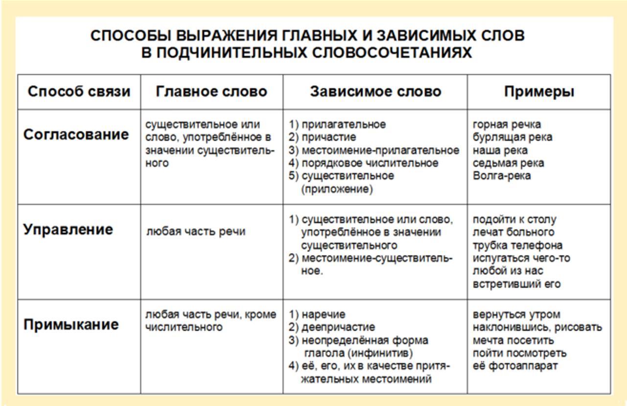 3. смотрим в таблицу (со временем Вы запомните виды словосочетаний и таблица уже не понадобится), определяя вид связи слов