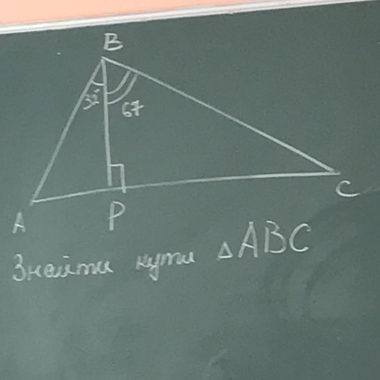 Кут С=180⁰-(кут СВР+ кут ВPС)=180⁰-(67⁰+90⁰)=23⁰, аналогічно знаходимо кут А=180⁰-(кут РВА+ кут ВРА)=180⁰-(32⁰+90⁰)=58⁰