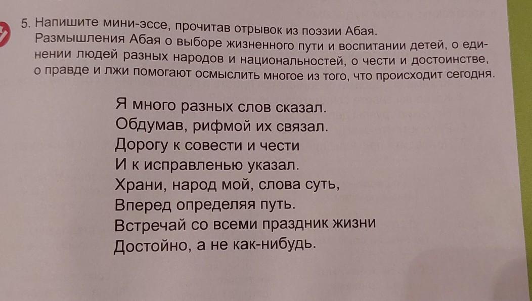 Напишите мини-эссе, прочитав отрывок из поэзии Абая. Размышления Абая о выборе жизненного пути и воспитании детей, o еди нений людей разных народов и национальностей, о чести и достоинстве, о правде и лжи помогают осмыслить многое из того, что происходит сегодни.
