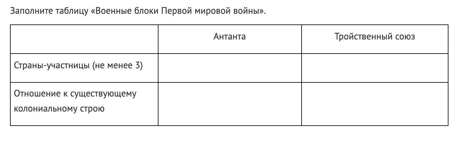 Отношение в существующему колониальному строю Антанта и Австро-Венгрия (писать вместе в табл.):Антанта и Тройственный союз были крайне заинтересованы в территории Балканского полуострова, Ближнего и Среднего востока. Германия желала захватить часть Франции и ее колонии; Австро-Венгрии был необходим контроль над Балканами; Англия преследовала цель ослабить положение Германии, закрепить за собой мировую рыночную монополию, а также сохранить морское могущество; Франция мечтала вернуть отнятые в ходе франко-прусской войны территории Эльзаса и Лотарингии; Россия желала укорениться на Балканах, захватить западные земли Германии.