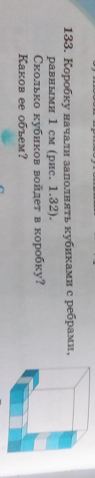 133. Коробку начали заполнять кубиками с ребрами, равными 1 см. (рис. 1.32). Сколько кубиков войдёт в коробку? Каков её объем?